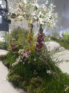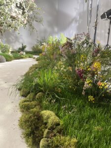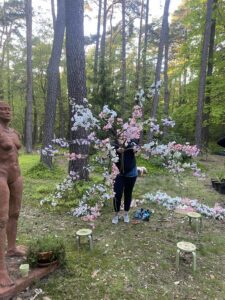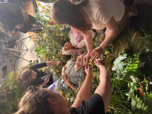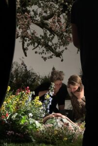 Otaczając ją, zbudowałyśmy łąki wypełnione kwiatami – mieszanką roślin żywych i sztucznych, starannie dobranych pod względem koloru, gatunku i faktury, by stworzyć wrażenie naturalnego przepychu.