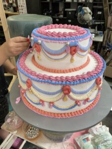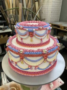 Na potrzeby programu, a konkretnie odcinka poświęconego sesjom zdjęciowym z rodziną uczestników, przygotowałyśmy przeskalowany mock-up ozdobnego tortu. Konstrukcja została zaprojektowana jako efektowny element scenografii, będący zarówno symbolicznym rekwizytem, jak i tłem do zdjęć.