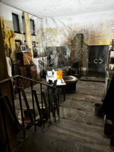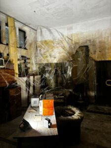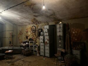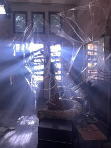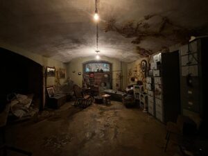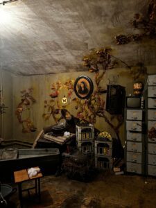 Na potrzeby reklamy Opowieści z krypto podrasowałyśmy istniejącą lokację, dodając sporo niepokojącego klimatu. Na ścianach pojawiły się niezidentyfikowane grzyby, przestrzeń wypełniły warstwy filmowego brudu, a kulminacją całości była przeskalowana pajęczyna z kokonu, w którym zawisł aktor. Efekt? Czyste (a raczej bardzo brudne) postapo.