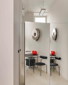 Formy rzeźbiarskie stanowią jednocześnie dekorację i integralną część funkcjonalnego wyposażenia, dodając przestrzeni unikalnego, butikowego charakteru.