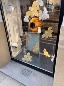 Na potrzeby aranżacji strefy klienta podczas targów, a później ekspozycji w witrynie warszawskiego lokalu, stworzyłyśmy organiczną rzeźbę inspirowaną ulem. Obiekt nawiązywał do nowej kolekcji z motywem pszczół i świetnie wpisał się w całościową koncepcję wizualną marki.