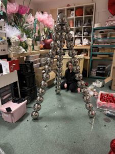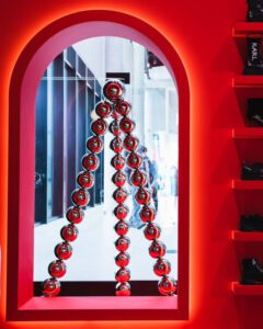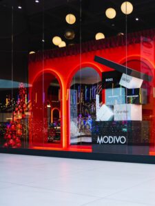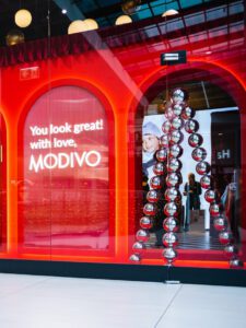 Na potrzeby świątecznej aranżacji witryny w warszawskim centrum handlowym stworzyłyśmy dekoracje wykonane na zamówienie. W projekcie znalazły się dwie abstrakcyjne choinki oraz duża, efektowna kokarda na ladę kasową. Całość dodała przestrzeni charakteru i świątecznego klimatu – bez dosłowności, ale z wyraźnym nawiązaniem do tematu.