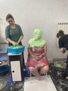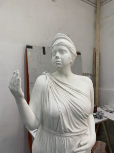 Do reklamy Zalando stworzyłyśmy “antyczną” rzeźbę. Z modelki częściowo zostały ściągnięte formy do odlewów, a cała reszta została ręcznie wyrzeźbiona z różnych materiałów. Ze względu na gabaryt starałyśmy się, aby nasza rzeźba była jak najlżejsza stąd użycie takich materiałów jak np. styropian.