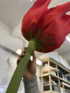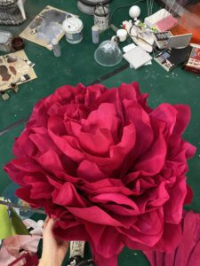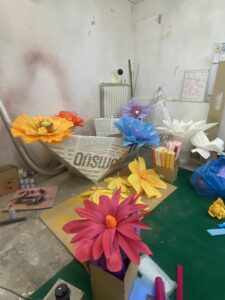 Wśród nich znalazły się kwiaty-giganty, wykonane z lekkich materiałów i ręcznie malowane, by jak najwierniej oddać strukturę płatków i łodyg.