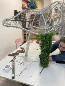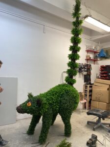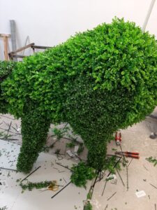 Na potrzeby reklamy Orange stworzyłyśmy nietypową rzeźbę ogrodową – sztuczny bukszpan uformowany w… kotolemura. Ten osobliwy zwierzak powstał zgodnie ze scenariuszem i idealnie wpisał się w lekko surrealistyczny klimat spotu. Niecodzienna forma, ale dokładnie taka, jakiej wymagała ta historia.