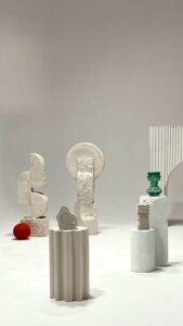 Na potrzeby reklamy stworzyłyśmy trzy rzeźby-totemy, mając sporą swobodę projektową – dzięki temu mogłyśmy zaszaleć z formą i wyrazem. Uzupełnieniem projektu były trzy abstrakcyjne, malarskie dzieła, które dopełniły całości w artystyczny i nietypowy sposób wciągając widza w galeryjny świat.