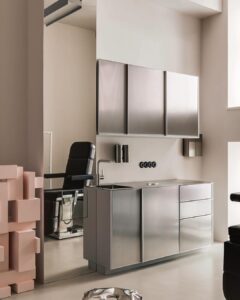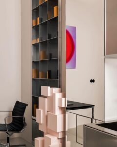 Formy rzeźbiarskie stanowią jednocześnie dekorację i integralną część funkcjonalnego wyposażenia, dodając przestrzeni unikalnego, butikowego charakteru.