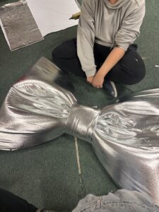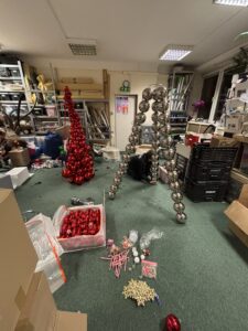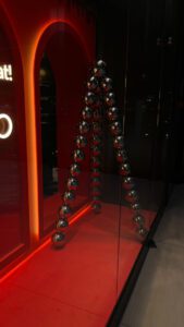 Na potrzeby świątecznej aranżacji witryny w warszawskim centrum handlowym stworzyłyśmy dekoracje wykonane na zamówienie. W projekcie znalazły się dwie abstrakcyjne choinki oraz duża, efektowna kokarda na ladę kasową. Całość dodała przestrzeni charakteru i świątecznego klimatu – bez dosłowności, ale z wyraźnym nawiązaniem do tematu.